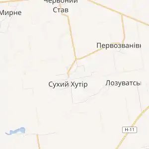 Село Сухий Хутір знаходиться на відстані 0,5 км від села Лозуватське і за 1,5 км від села Первозванівка. По селу протікає пересихаючий струмок з загатою.