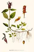 Як правило, багаторічні трави 5–30 см заввишки. Стебла при основі значно гіллясті, висхідні, вкорінені, 4-кутні, рідко короткошерсті вздовж краю, як правило, частково фіолетово. Листки супротивні, черешки 0.7–2.5 см; пластини від ланцетних до яйцевидих, 1.5–6 × 0.6–2.5 см, з тупим кінцем, волохаті, від з цілими краями до мало і неглибоко тупо-зубчастими. Приквітки фіалкові, широко серцеподібні, близько 7 × 11 мм, загострені. Суцвіття — щільні, колосоподобні на кінцях стебел, 2–4 см. Квіти: віночки синювато-фіалкові, іноді червонуваті або білі, 8–15 мм завдовжки, двогубі; верхні губи опуклі, нижні губи із зубчастими краями. Чашечки вузько дзвонові, двогубі, 5-лопатеві. Тичинок 4, з яких 2 коротких, 2 довгих. Плоди 4-дольні. Напівплодики злегка сплюснуті, жовтувато-коричневі з темними смугами, основи з м'якої тканини.