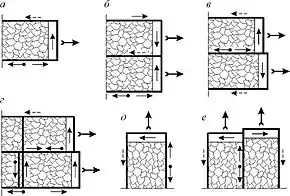 Різновиди суцільної системи розробки: а – лава-поверх (ярус); б – лава-поверх (ярус) із середнім вентиляційним штреком; в – зі спареними лавами в поверсі (ярусі); г – з поділенням поверху (ярусу) на підповерхи (під'яруси); д, е – з виїмкою лавами за підняттям, відповідно, однарними і спареними.