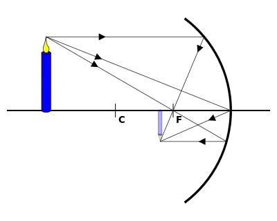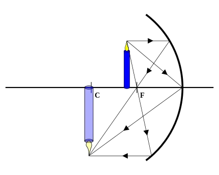 ![]() Якщо предмет наближений до дзеркала та розташований на відстані, що перевищує відстань від дзеркала до його центра, то зображення його буде дійсним, оберненим і зменшеним і розташується на відрізку між центром та фокусом. |