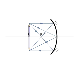 Якщо сферичне дзеркало увігнуте, можливі різні випадки розташування зображення щодо дзеркала при різних відстанях до предмета. Буквою C позначено центр дзеркала, а буквою F — його фокус. При u>f формула дзеркала має вигляд: