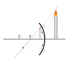 ![]() Якщо предмет між фокусом і дзеркалом, то зображення — уявне, пряме, збільшене, розташоване по інший бік дзеркала від предмета. |