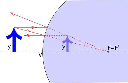 Побудова зображення в опуклому сферичному дзеркалі простіша, ніж в увігнутому: тут за будь-якої відстані від предмета до дзеркала його зображення розташоване за дзеркалом. На малюнку нижче буквою F позначено фокус опуклого дзеркала, буквою V — полюс, y — висота предмета, y' — висота зображення. Формула дзеркала в цьому випадку має вигляд: