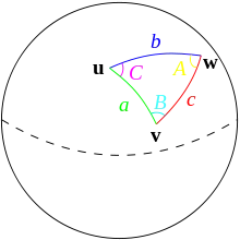- Для обчислення надлишку сферичного трикутника за сторонами a, b і кутом C між ними використовується формула[1]: