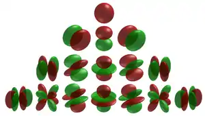 Візуальне зображення перших декількох сферичних гармонік. Червоний колір вказує на додатність функції, зелений на від'ємність.