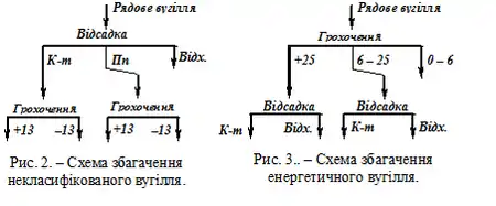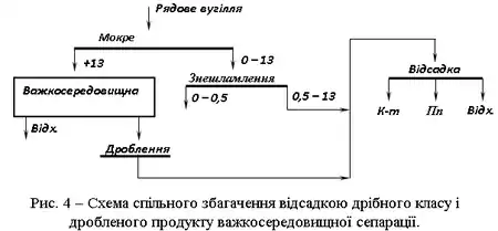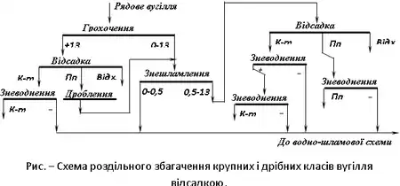 При роздільному збагаченні крупних і дрібних класів вугілля відсадкою воно розділяється на грохотах і направляється у відсаджувальні машини, у яких розділяється на три продукти (концентрат, промпродукт і відходи). Промпродукт, одержуваний у результаті збагачення крупного класу, дробиться до 13 мм і спрямовується на збагачення разом із дрібним машинним класом (рис. 1).