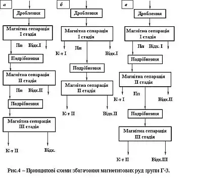 При нерівномірному і крупному вкрапленні магнетиту і порожньої породи, представленої більш крупними, ніж магнетит, виділеннями, і при знижених вимогах до якості концентрату економічно вигідна схема, показана на рис 4 в. Недолік цієї схеми — неможливо одержати високоякісний концентрат у другій стадії збагачення.