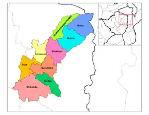 Провінція Східний Машоналенд підрозділяється на 9 районів: Чікомба, Горомонза, Хредза, Марондера, Мудзі, Мурева, Мукото, Секе і Узумба-Марамба-Пфунгве.