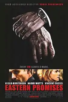 «Східні обіцянки» в українському прокаті йшов під назвою «Порок на експорт» (англ. Eastern Promises) — гостросюжетний фільм канадського режисера Девіда Кроненберга, присвячений життю російських злодіїв у законі в Лондоні. У головних ролях — Вігго Мортенсен, номінований за неї на премії «Оскар» та «Золотий глобус», Наомі Воттс та Венсан Кассель.