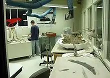 Для перевезення кісток до Чикаго музей найняв спеціалізовану компанію з досвідом транспортування крихких предметів. Також МакДональдзом були створені та укомплектовані дві нові науково-дослідні лабораторіїː одна лабораторія була в самому музеї, а інша - у нещодавно відкритому Disney's Animal Kingdom у Дісней Ворлд в Орландо. Мільйони відвідувачів спостерігали за відновленням кісток Сью через скляні вікна в обох лабораторіях. Кадри процесу також розміщені на вебсайті музею. Позаяк декілька кісток так і не були виявлені, їх замінили на пластикові відповідники для завершення експонату. Модельовані кістки були забарвлені в пурпурний відтінок, щоб відвідувачі могли зрозуміти, які кістки справжні, а які - пластикові. Також були створені зліпки кожної кістки і проведена комп'ютерна томографія. Найбільшою ж проблемою при скануванні виявилася неможливість провести діагностику черепа Сью, оскільки він був занадто великим, щоб вміститися до будь-якого з відомих на той час сканера. Вирішити проблему допомогла лабораторія Boeing в Каліфорнії, котра дозволила музею використати свій КТ-сканер, який зазвичай використовується для огляду деталей Спейс-Шаттл.