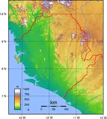 Приатлантична частина Сьєрра-Леоне, найбільш населена і зручна для сільського господарства, являє собою низовину, що полого спускається до океану. Однак на північному сході країни, на території Леон-ліберійського гірського масиву, рельєф більш нерівний, середньою висотою близько 600 м. Найвища точка країни — гора Бинтимані (1945 м). Північна частина країни також гориста, на її території розташовуються відроги масиву Фута-Джаллон.