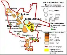 | Чинники зростання агломерації | великий паливо-енергетичний центр, перепуття головних транспортних шляхів, хімічна і машинобудівна промисловість, доступність води річки Сіверський Донець. |