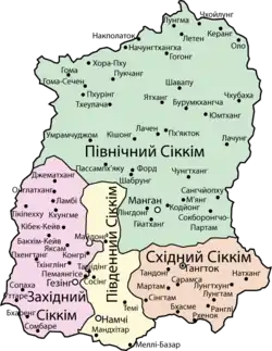 | Східний Сіккім (англ. East Sikkim) | 954 | 283 583 | 297 | Ґанґток | Ґанґток (англ. Gangtok), Пакйонґ (англ. Pakyong) і Ронґлі (англ. Rongli) |