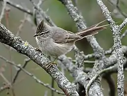 Довжина птаха становить 16 см. Забарвлення переважно сіре, нижня частина тіла світліша, живіт має охристий відтінок. Крила темні, рудувато-коричневі, хвіст довгий, світло-коричневий. Над очима білі "брови". На голові помітний коричневий чуб.