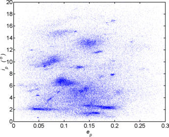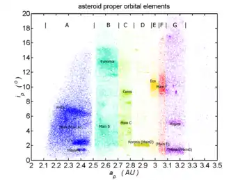 Якщо нанести відомі елементи орбіт астероїдів на діаграму залежності нахилу орбіти від ексцентриситету (або від великої півосі), можна легко помітити концентрації астероїдів у певних областях діаграми. Це і є сім'ї.