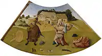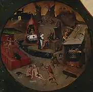 «Пекло» — зображено муки, які будуть переживати грішники після Страшного суду. У центрі чоловік шмагає грішника, на передньому плані біс біжить до чоловіка і жінки, що лежать на землі, а поруч із ними сидить павич. Зліва кипить котел, в якому кипітимуть грішники, над ним біс катує чоловіка мечем. На задньому плані зображено гори, на яких також мучаться люди, зліва видно ворота, через які біси гонять грішників. Композицію виконано в темних тонах.