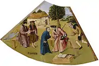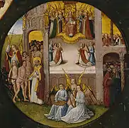«Рай» — виконано в яскравих тонах, превалює золотий, зелений колір. Вгорі зображено Ісуса Христа як Царя в оточенні ангелів. На передньому плані троє янголів грають на музичних інструментах. Справа стоять святі й праведники, зліва — апостол Петро зустрічає Адама і Єву, за якими слідують інші люди.