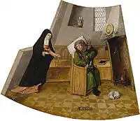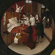 «Смерть» — помираючий лежить у ліжку. Священнослужителі сповідують його гріхи. По його ліву руку стоїть священик із книгою, за ним — його помічник і жінка, по праву руку — монах із розп'яттям. На задньому плані, в глибині кімнати, за столом сидять двоє жінок. із-за ліжка виглядає скелет із косою — це символізує наближення смерті. В нього цілиться чорний демон, що сидить поруч із янголом.
