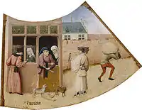 «Гнів» — двоє чоловіків б'ються перед таверною. Одному, з ножем в руці, на голову вдягли лавку. Позаду нього — перекинутий стіл. Чоловік справа замахується кинджалом, у правій руці тримає посудину. Його намагається зупинити жінка. Навколо розкидано одяг.