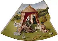 В кутах розташовано чотири тондо: «Смерть», «Страшний суд» згори та «Пекло» й «Рай» внизу. Зображення призначені нагадати глядачеві про швидкоплинність життя й те, що людина за життя своїми вчинками обирає, де їй перебувати — в пеклі чи раї. Загалом композиція твору нагадує Всевидяще око.