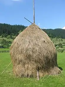 При традиційному способі господарювання сіно скошували, сушили й складали вручну: за допомогою кіс, граблів, вил та деяких інших знарядь. Зрізана косою трава лягала в широку смугу — прокі́с, покі́с[4][3], ручку[5]. Підсохле сіно з кожного покосу згрібали дерев'яними граблями в довгу купу — вал, валок[6][7] (це називається валкуванням)[8]. З валків потім складали маленькі стіжки — копиці[9] (це називається копиченням)[10], а з них — великі стоги, скирти (це називається стогуванням)[11]. Для перенесення оберемків сіна використовували штилі, цапари, ключі. Штиль являв з себе простий загострений кілок[12], цапар складався зі смерекового стовбура (шинара) з кругом очищених гілок (кальбук) на одному кінці; сіно накладалося на гілки й фіксувалося розщепленою палицею — роскопом[13]. Різновидом цапара був ключ — він мав чотири гілки (наріжники)[14].