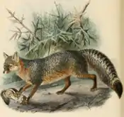 Сіра лисиця[2][3] (Urocyon cinereoargenteus) — вид псових, що живе в листяних лісах та густих чагарниках у Північній, Центральній і Південній Америці від Канади до Венесуели. Цей вид разом із близько спорідненою лисицею острівною є сучасними видами, найближчими до спільного предка псових. Цілком можливо, що в давні часи сіра лисиця була приручена або напіводомашнена корінними американцями сучасних Каліфорнії та пустелі Сонора, де її останки знайдені в різних археологічних розкопках[4]. Етимологія: родова назва походить від грец. οὐρά — «хвіст», грец. κύων — «пес»; видовий епітет походить від грец. κόνις — «попелястий», лат. argenteus — «сріблястий»[5]. Зображення сірої лисиці можна знайти у природничих працях, прикладами є гравюра, виконана Йоханесом Ґерардом Кьолемансом до книги «Dogs, jackals, wolves, and foxes: a monograph of the Canidae» (1890) і малюнок з праці «The New International Encyclopedia», v. VIII, 1906. Також сіра лисиця зображалася на марках анімалістичних серій США[6], Екваторіальної Гвінеї[7], Колумбії[8], Коста-Рики[9], Парагваю[10]. Сіра лисиця є офіційною твариною штату Делавер[11].