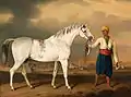 Арабський жеребець Малькольм сірої масті з грумером на фоні пустельного пейзажу арабського містечка та піраміди, 1819, Генрі Бернар Шалон.