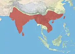 Поширений у більшій частині Індії (крім північного заходу), далі на схід до китайських провінцій Сичуань і Юньнань і потім на південний схід, охоплюючи майже всю територію Індокитаю за винятком Малайського півострова. Переважно осілий або мандрівний вид, в низов'ях Гімалаїв пташки в зимовий час переміщуються в долину Катманду. Тримається серед листя дерев в рідколіссі або на галявинах. У горбистій місцевості не піднімається вище 800 м над рівнем моря[3].