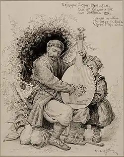 ![]() Портрет кобзаря Петра Сіроштана» О. Сластіона. 1887. | |