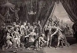 ![]() Сісигамбіда на колінам перед Гефестіоном та Олександром Македонським | |