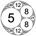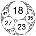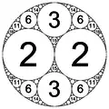 - Від'ємна кривина вказує на те, що всі інші кола дотикаються до цього кола зсередини. Це обмежувальне коло.