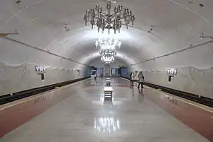 Колійні стіни оздоблені білим мармуром, верхній край фігурний. Назва станції набрано з великих литих металевих букв художнього шрифту, верхня частина букв лежить на темній прямокутної металевої підкладці. Самі букви рельєфно виступають над дорожніми стінами. Показчик станцій в кожному з напрямків виконаний не у вигляді горизонтальної стріли, як це зроблено на станціях першої черги, а є трьома табличками з перерахуванням в стовпчик станцій, що передують даній, станцій, розташованих далі по ходу руху і назва даної станції. Підлога оздоблена червоною та сірою гранітною плиткою, по краях платформи викладена лінія з білого мармуру.