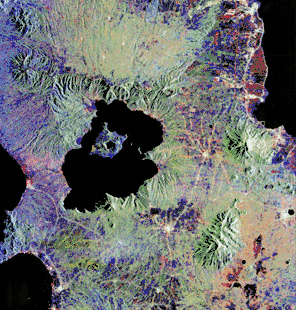 ![]() Супутниковий знімок показує озеро Тааль із Вулканічним островом на ньому | ||||