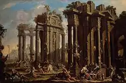 Картина належить до декоративних творів, котрі випускала майстерня Алессандро Маньяско для декору палацових інтер'єрів і носила фантазійний характер. Твір не є побутовою сценою з життя бандитів, хоча низка персонажів картини не належала до людей з грошима, з освіченим дозвіллям і добробутом. В декоративному творі використані знахідки театральної декорації. Звідси пишна архітектурна руїна на тлі далекого пейзажу, побудована діагонально, як це робили і театральні декоратори Італії. Картина має двох авторів. Пишна архітектурна руїна — це робота італійського художника Клименте Сперо. Фігурки людей, що практично виконують роль стафажу і не головують в картині, виконав Алессандро Маньяско. Твір входить до серії декоративних композицій, де дві — сцени «вакханалій», а останні дві — так звані «Табори бандитів».