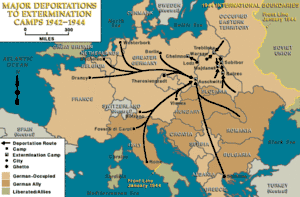 | Табір смерті – в нацистській Німеччині концентраційний табір, спеціально призначений для масового знищення (Vernichtung) небажаних осіб у Третьому Рейху та завойованих територіях. Жертвами таборів були переважно євреї, але також рома (цигани), слов’яни, гомосексуали, психічно хворі та ін. Табори смерті відіграли центральну роль в Голокості[8]. Оригінальний текст (англ.) .Extermination camp – Nazi German concentration camp that specialized in the mass annihilation (Vernichtung) of unwanted persons in the Third Reich and conquered territories. The camps’ victims were mostly Jews but also included Roma (Gypsies), Slavs, homosexuals, alleged mental defectives, and others. The extermination camps played a central role in the Holocaust. |