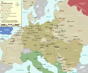 Найбільшим табором смерті був Аушвіц; до весни 1943 року там працювали чотири газові камери, в яких використовувався газ Циклон Б[20][21]. У період, коли в табір надходило найбільше ув'язнених, щодня труїли газом до 6000 євреїв[22]. До листопада 1944 року в Аушвіці загинуло більше мільйона євреїв, а також десятки тисяч циган, поляків та радянських військовополонених[23].