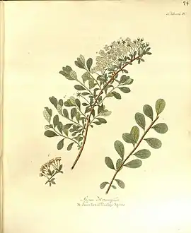 Кущ, 0.5–1.5 м заввишки. Суцвіття волотисте, з пазушних зонтиків. Квіти 5–8 мм в діаметрі[1]. Гілки прямі, розлогі; гілочки від бурих до сіро-коричневих, стрункі, голі або дрібно опушені, коли молоді; бруньки яйцеподібні, малі, з кількома коричневими лусочками, голі або підголі, вершини гострі. Черешок 1–4 мм, голий; листові пластини довгасто-зворотнояйцеподібні або зворотнояйцеподібно-ланцетні, 1.5–2 × 0.5–0.7 см, зазвичай гладкі, рідко опушені на обох поверхнях, краї цілі, верхівка тупа або гостра. Чашолистки трикутні, 1.5–2 мм, підняті у плодах, вершини гострі. Пелюстки білі, субкулясті або зворотнояйцеподібні, 3–3.5 × 3–4 мм, голі, верхівка тупа. Тичинок 20, від трохи коротших до майже рівних пелюсткам[3].