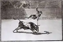 | Таврокатапсія на фресці з Кноссу, Археологічний музей Іракліону | Мінойска фігурка, Археологічний музей Іракліону | Тавромахія в Мадриді на гравюрі Гойї |
