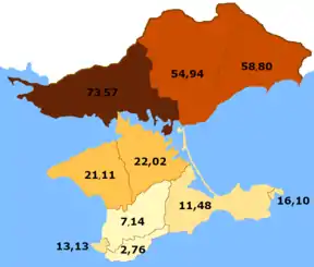 | Севастопольське г / н | 57 455 | 13,1 % | 62,8 % | 3,3 % | 1,6 % | 6,4 % | 0,1 % | 5,0 % | 4,9 % | 0,3 % | 0,8 % |