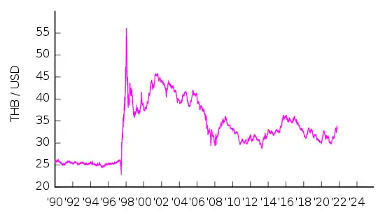 Протягом 1956—1973 років, тайський бат був прив'язаний до долара США на рівні 20,8 бат за долар, після чого зміцнений до 20 бат за долар. Посилення економіки США змусило Таїланд послабити свою валюту до 25 бат за 1 долар у 1978 році. Ця прив'язка проіснувала до 2 липня 1997 року, коли внаслідок Азійської фінансової кризи країна змушена була перейти на плаваючий валютний курс який існує по сьогодні. Під час кризи валюта Таїланду опускалася до 55 бат за 1 долар, однак за кілька років стабілізувалася на рівні приблизно 40 бат/долар. В 2007—2010 рр. вона зміцнилася до 30-35 бат/долар.