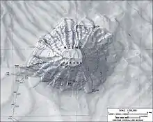 Вершину вулкана вінчає велика, діаметром 8 км, круглої форми, кальдера.