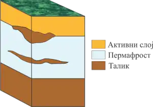 Талик, що пронизує мерзлу товщу наскрізь, наз. наскрізними, а талик, що підстилаються на деякій глибині мерзлими породами, ненаскрізними. Талик, що містять підземні води являють небезпеку при проходженні глибоких гірничих виробок.