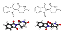 Молекула талідоміду може існувати у вигляді двох оптичних ізомерів — право- та лівообертального.[19] Один з них забезпечує терапевтичний ефект препарату, у той час як другий є причиною його тератогенного впливу. Цей ізомер вклинюється в клітинну ДНК на ділянках, багатих GC зв'язками, і перешкоджає нормальному процесу реплікації ДНК, необхідному для поділу клітин і розвитку зародка.