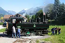 ![]() Тамсвег. ![]() Розвертання паровозу Bh.1 на поворотному крузі на станції селища Тамсвег. |