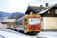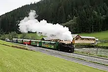 ![]() Поїзд на вузькоколійній залізниці між Мадлінгом і Тамсвегом. 2005 рік. ![]() |