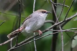 Це невеликий птах з відносно довгим східчастим хвостом. Верхнячастина тіла сірувато-коричнева, тім'я, лоб і потилиця рудувато-коричневі. Нижня частина тіла світло-сіра, горло і верхня частина грудей білі.