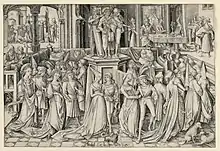 ![]() Танець при дворі Гелода, гравюра Israhel van Meckenem, c. 1490 |