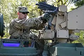 Командир танку з американської команди виконує вогневу вправу з пістолетом