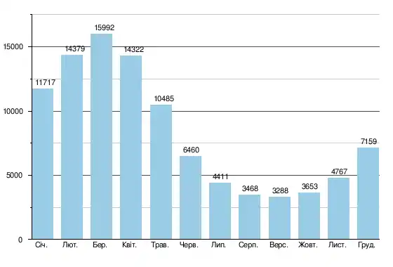 На графіку приведено показники середньомісячної витрати води річки Тапажос за 20 років спостереження (1975–1994) на гідрометричній станції Барра Сан Мануель-Жусанте, м³/с: