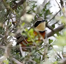 Птах завдовжки 15 см та вагою 16,7-18,2 г. Верхня частина тіла оливково-сірого забарвлення. Горло та надбрівна смуга, яка проходить від дзьоба і аж по всій довжині шиї, вохристого кольору. Лице чорне. Груди та черево іржавого забарвлення. Між горлом та грудьми проходить чорна смуга у формі півмісяця. У центрі спини є біла кругла пляма, яку видно коли тварина розпрямляє крила. Дзьоб чорнуватого кольору, лапки сіро-рожеві.